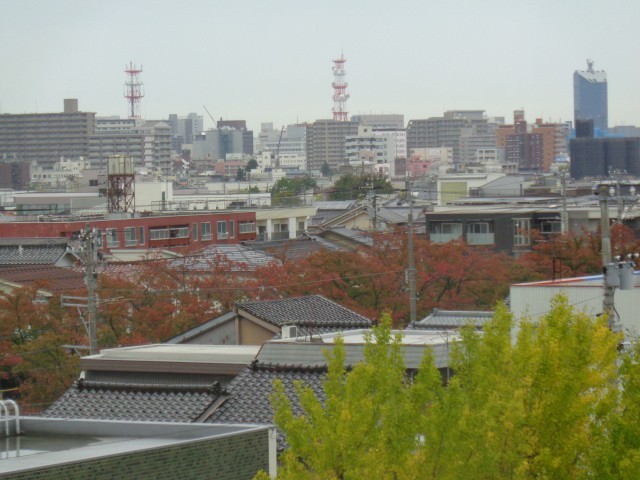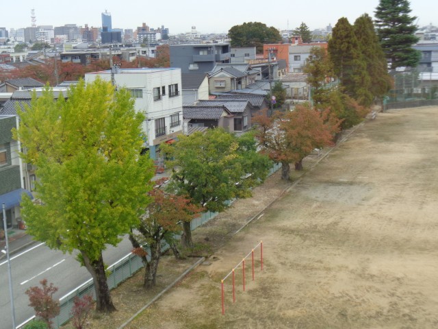 グラウンド横の木々が色づいています。いたち川沿いの桜並木も赤く色づいています。