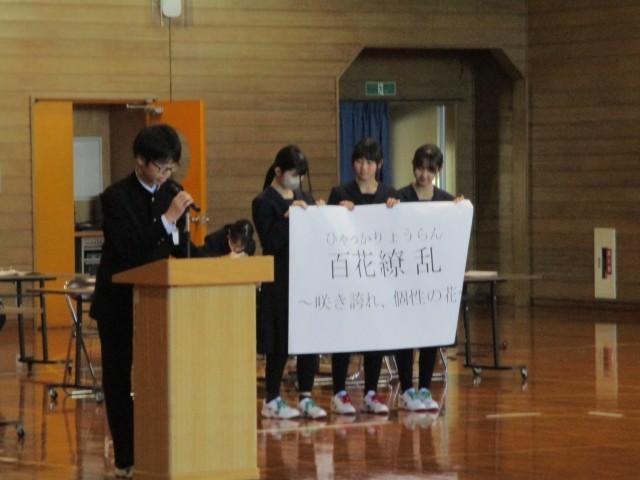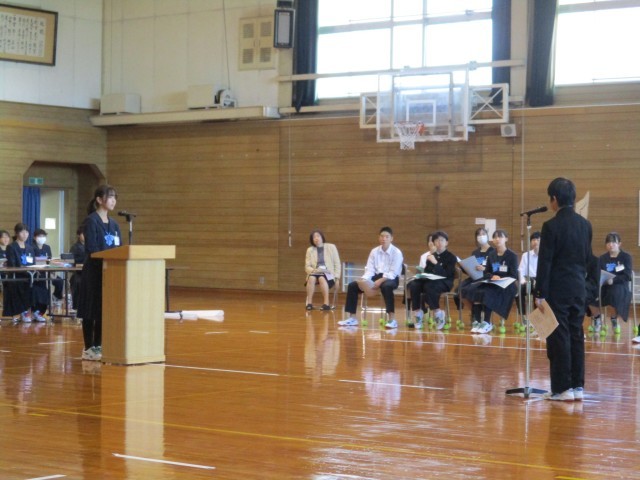 本日、令和7年度の後期の生徒会活動についての生徒総会が行われました。はじめに執行部から、7年度の後期生徒会スローガンが発表されました。また、執行部・委員会から活動計画案と学級討議で出された意見についての回答を説明しました。現状に満足せず、より快適な大泉中を全校で目指していきましょう。