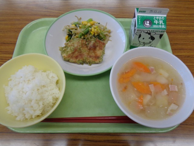 メニューは、ごはん、牛乳、豚肉の磯部揚げ、コーン和え、ポテトスープでした。おいしくいただきました。
