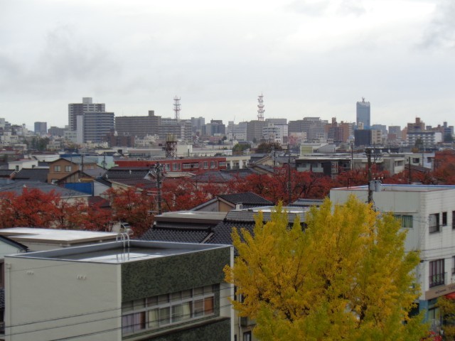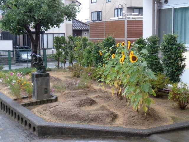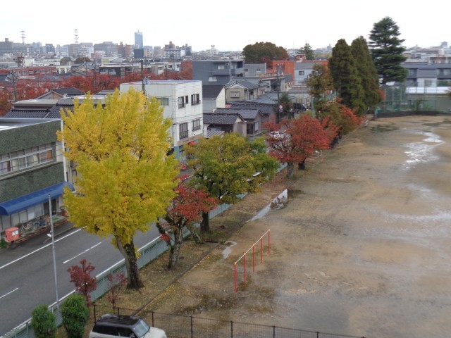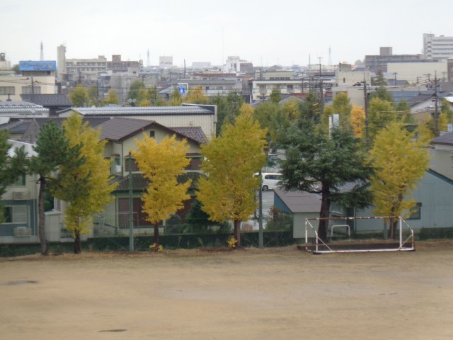 グラウンドの周辺の植物の紅葉がとても美しくなってきました。校舎から見えるいたち川沿いのサクラも赤く紅葉しています。前庭にはヒマワリが咲いています。秋咲のヒマワリです。