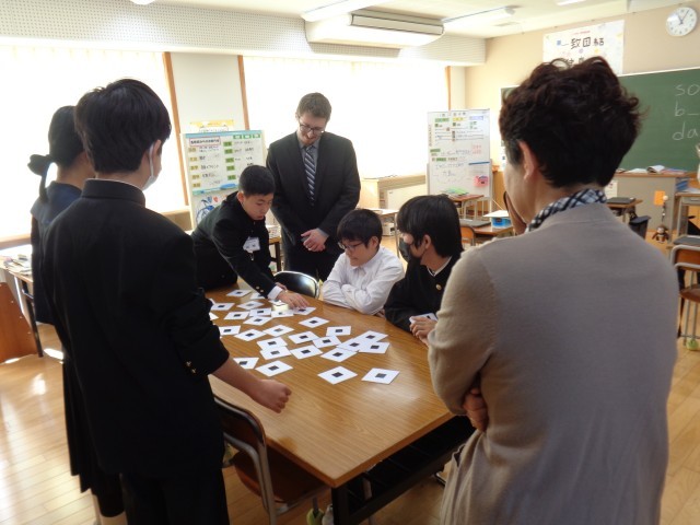 ALTの先生と一緒にカードゲームをしています。みんな仲良く取り組んでいました。