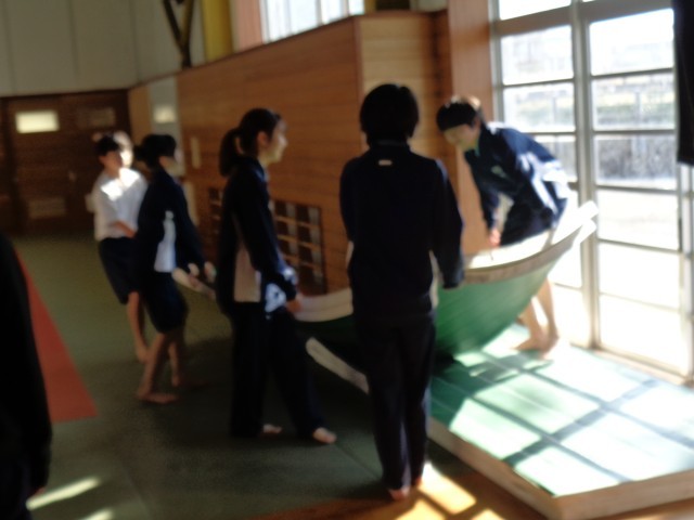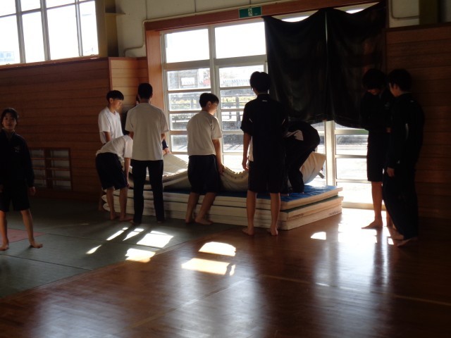 2年生の保健体育です。授業の終り頃だったので、誠道館でマットの片づけをしていました。みんなで協力していました。