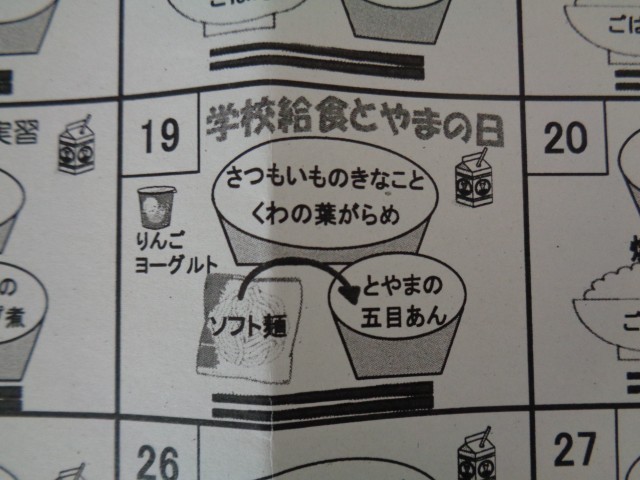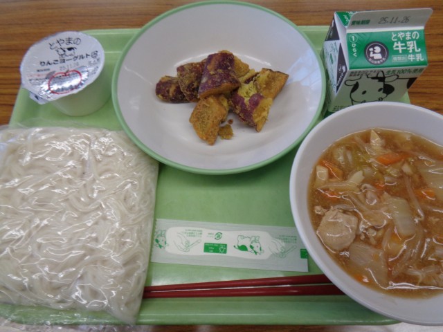 今日は学校給食とやまの日です。メニューはソフト麺、牛乳、とやまの五目あん、さつまいものきなことくわの葉がらめ、リンゴヨーグルトでした。とやまの食材をおいしくいただきました。