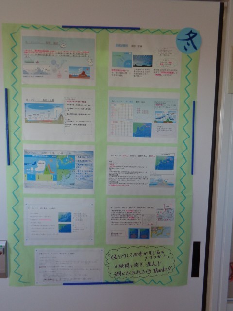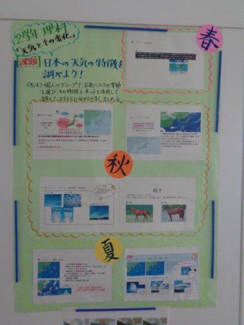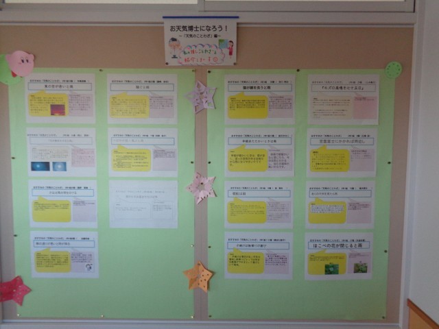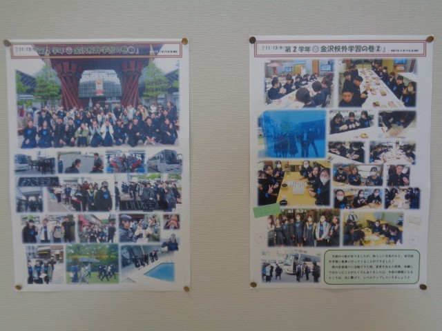 2年生の廊下掲示です。理科で学習した天気の調べ学習、先日の金沢校外学習の写真が掲示されています。