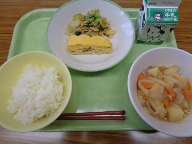 メニューは、ごはん、牛乳、千草焼き、いり大豆和え、ベーコンとじゃがいもの煮物でした。おいしくいただきました。