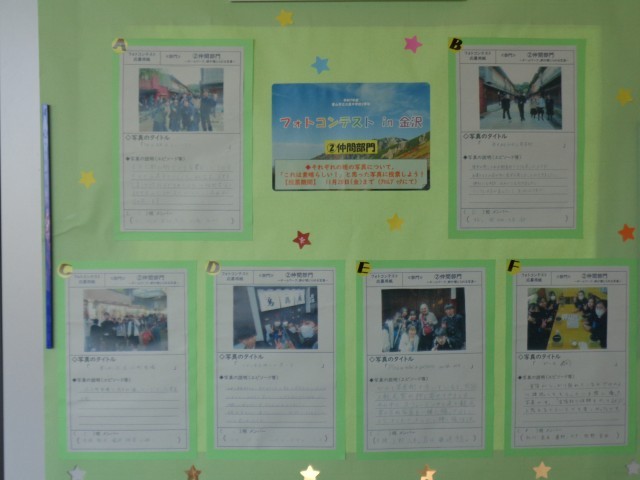 グループごとに金沢のまとめをしました。また、グループで撮影した写真をコンテスト形式で投票する企画も行います。保護者懇談会で来校されたときに、ぜひご覧ください。