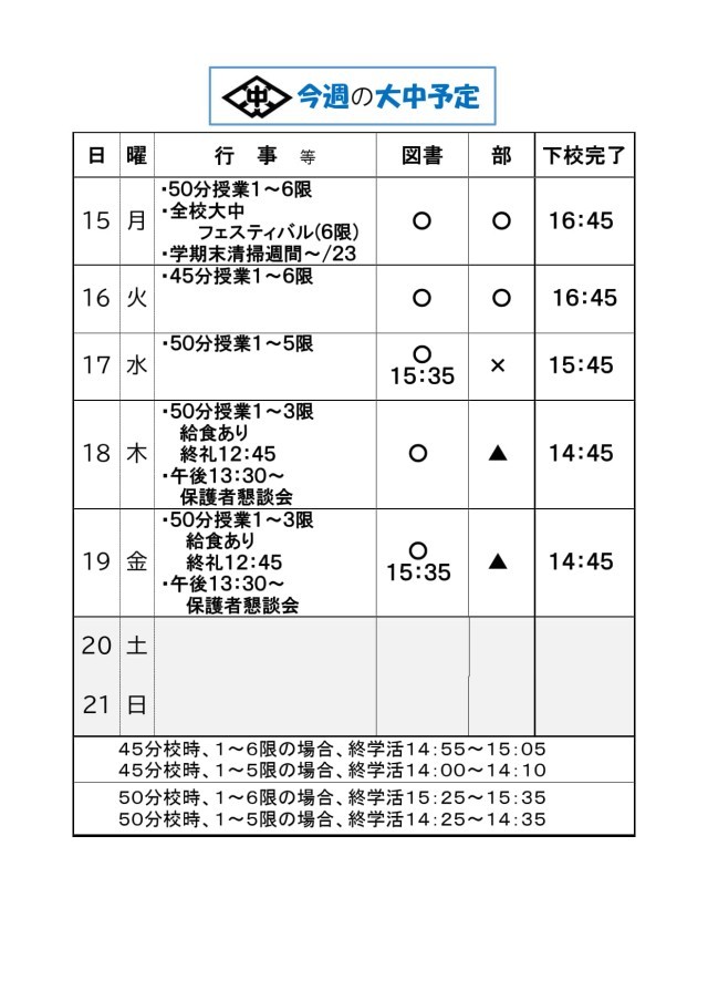 来週12/15~の大中予定をお知らせします。