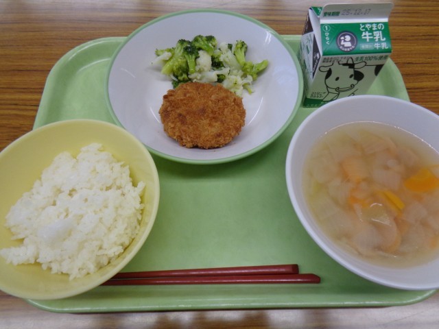 メニューは、ごはん、牛乳、メンチカツ、花野菜サラダ、ポテトスープでした。おいしくいただきました。