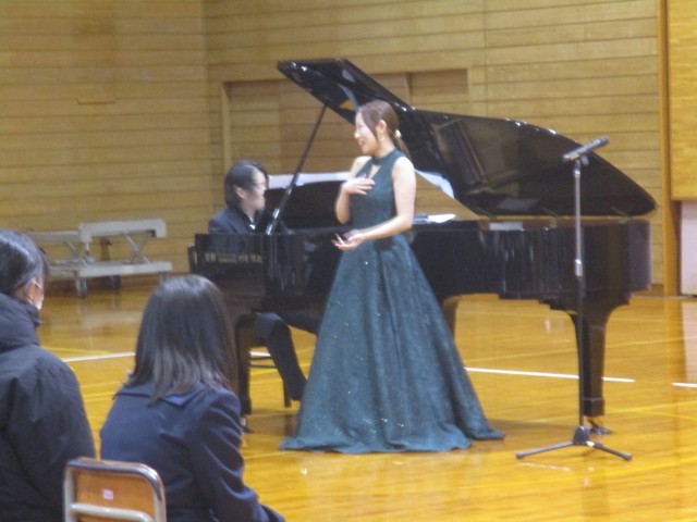 今日は、生徒にさまざまな芸術活動を親しませる目的で行われている「とやまアーティストマッチング事業」で富山県オペラ協会の方々に協力していただき「芸術鑑賞会」を行いました。ソプラノ歌手の高尾静佳さんとピアノ演奏者の瀬上純令さんをお迎えして、オペラ鑑賞をしました。生徒は、本物のもつ迫力に圧倒されつつ、素晴らしい歌と演奏に聞き入っていました。途中のお話も生徒に分かりやすくオペラの魅力を伝えていただいたので、生徒は非常に楽しく芸術に親しむことができました。