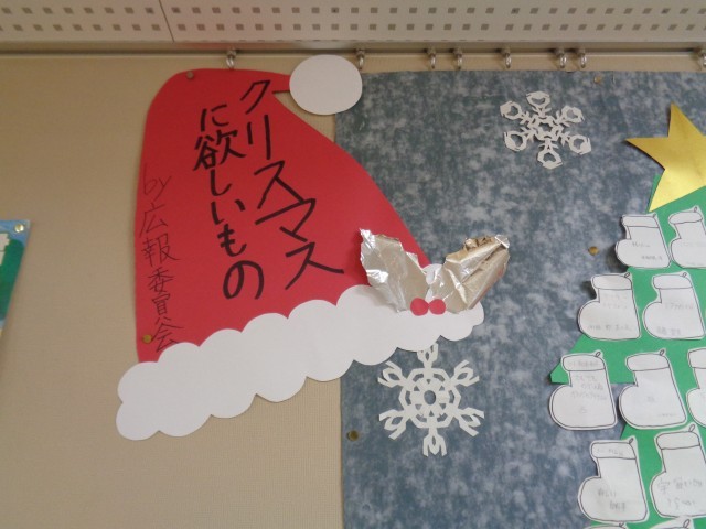 給食室前に「クリスマスに欲しいもの」の掲示がされました。たくさんの生徒や先生方の欲しいものが書かれています。作ってくれたみなさんありがとう!