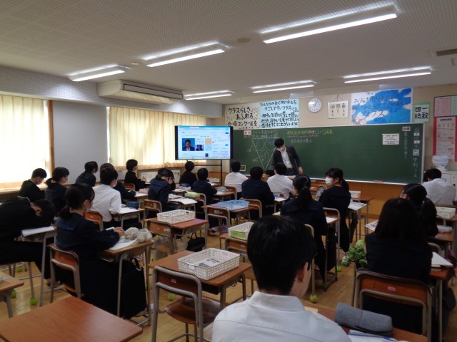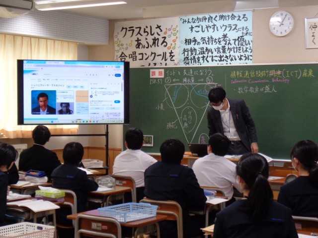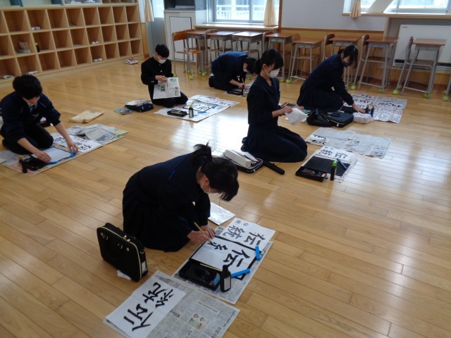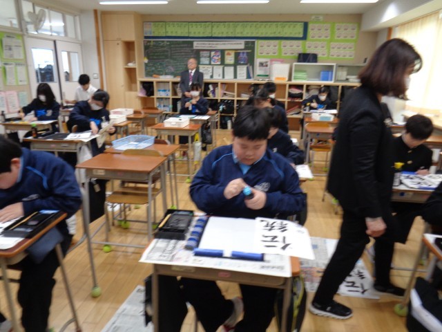 1年生の社会と国語です。国語は習字をしていました。書初め大会では「伝統芸能」と書きます。半紙に「伝統」の練習を静かに黙々と行っていました。新年の大会までにしっかり練習しておきましょう。