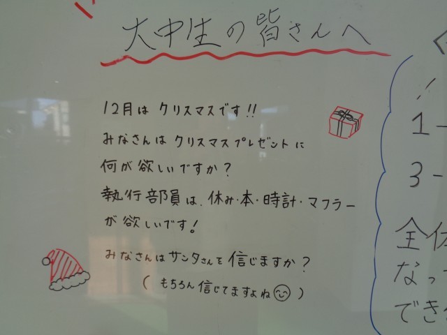 生徒玄関前のボードです。サンタクロースから何がもらえるのでしょうか?楽しみですね。