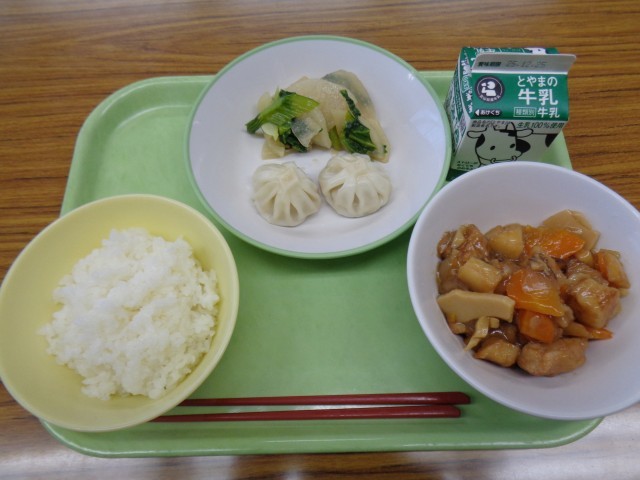 メニューはごはん、牛乳、えび包子、大根のナムル、酢豚でした。おいしくいただきました。