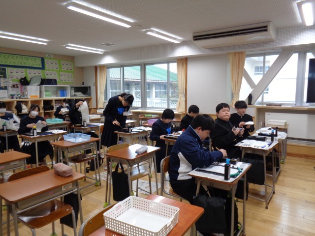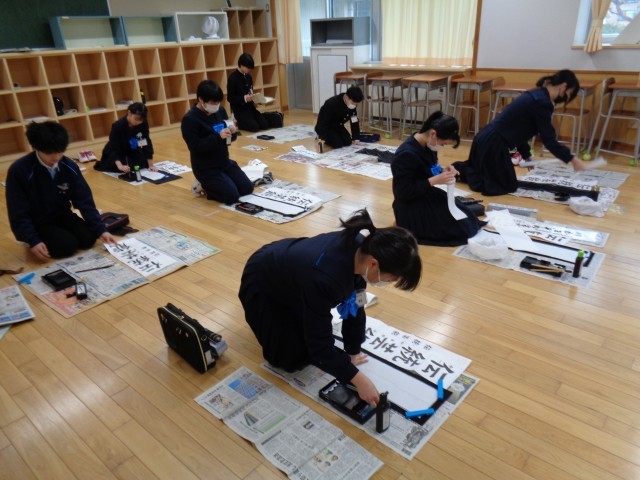今日は、全校一斉に書初練習会をしました。机を使う人、床で書く人などそれぞれでした。始業式の書初め大会が楽しみです。