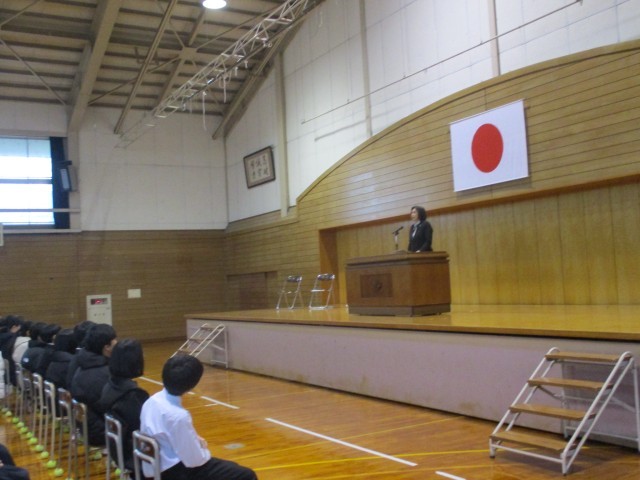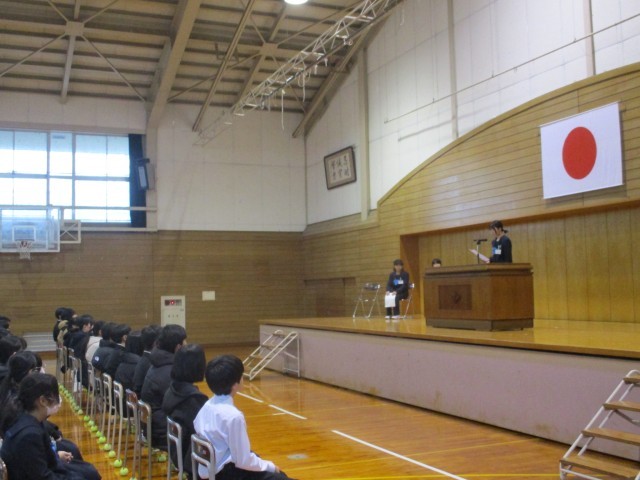 1/8(木)に始業式を行い、3学期がスタートしました。各学年の代表生徒が意見発表をし、今まで学んだ成果や今年頑張りたいことを発表しました。校長先生の式辞では、今年の干支である「馬」にちなんで、みんな前向きに目標に向かって仲よくがんばろうと話をされました。雪が降って寒い日が続きそうですが、生徒の皆さんは今学期も仲よく元気に学んでいきましょう。