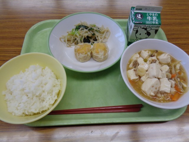 今日のメニューはごはん、牛乳、にんじんシューマイ、塩ナムル、マーボー豆腐でした。おいしくいただきました。