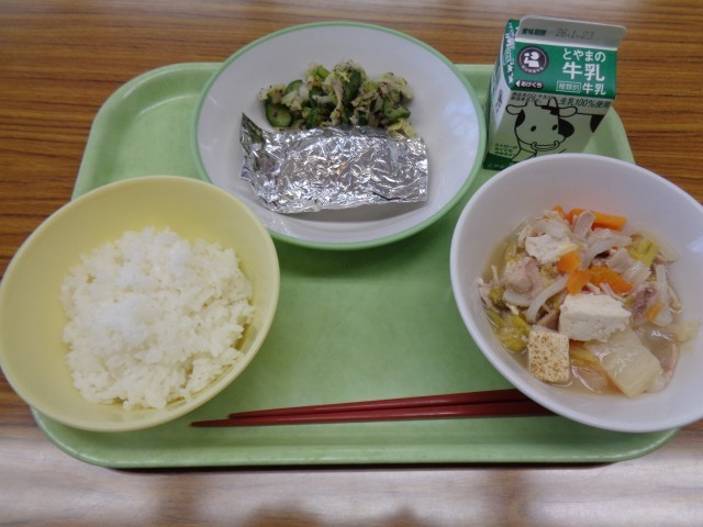 今日のメニューはごはん、牛乳、さばの銀紙焼き、ゆかり和え、はくさいなべでした。おいしくいただきました。