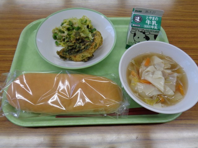 メニューはコッペパン、牛乳、ホキの磯部揚げ、アスパラガスのごまだれ、ワンタンスープでした。今学期初めてのパンでした。おいしくいただきました。