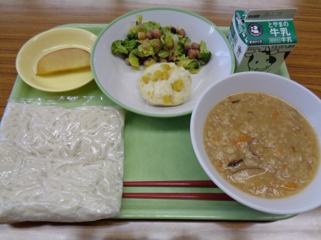 メニューはソフト麺、牛乳、ソフト面の肉みそ、蒸しパン、ビーンズサラダ、りんごでした。久しぶりのソフト麺をおいしくいただきました。