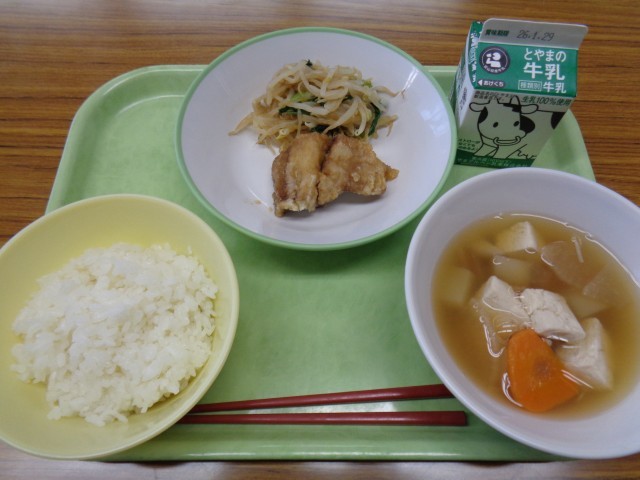 メニューは、ごはん、牛乳、あじの梅風味かば焼き、もやしのおひたし、のっぺい汁でした。おいしくいただきました。