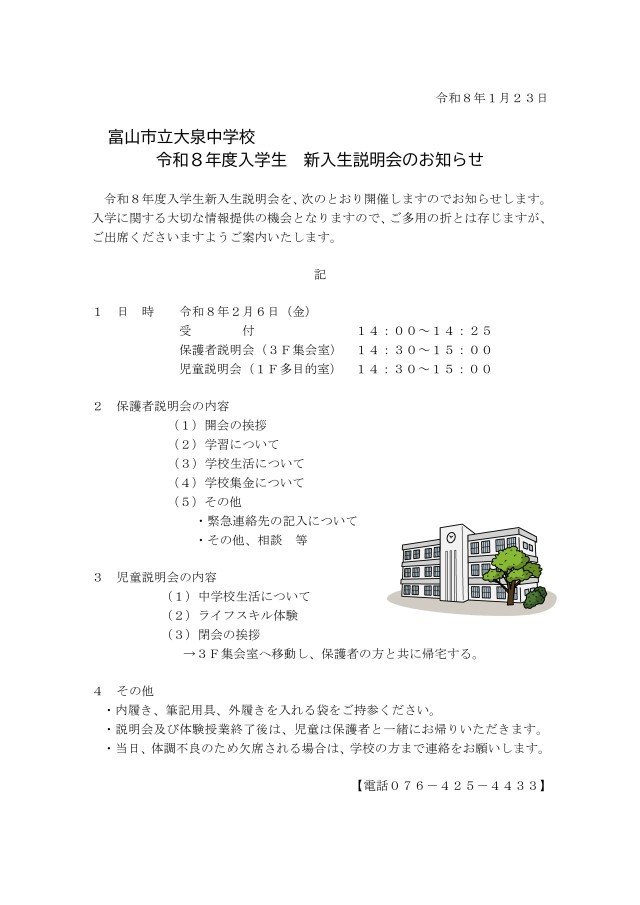 令和8年度入学生新入生説明会を2月6日(金)に開催します。入学に関する大切な情報提供の機会となりますので、ご出席くださいますようお願いします。