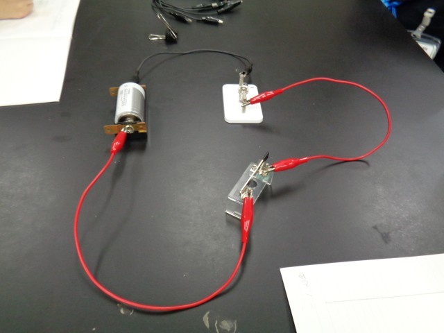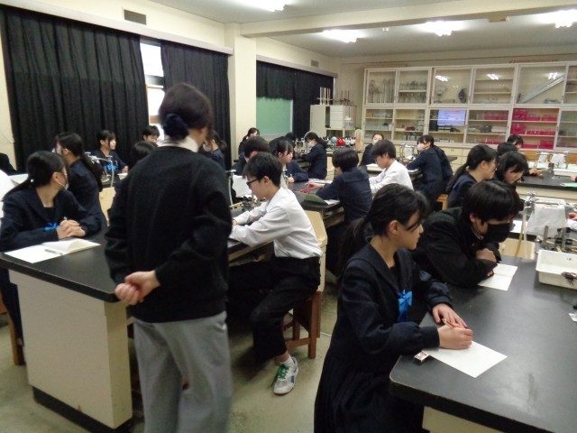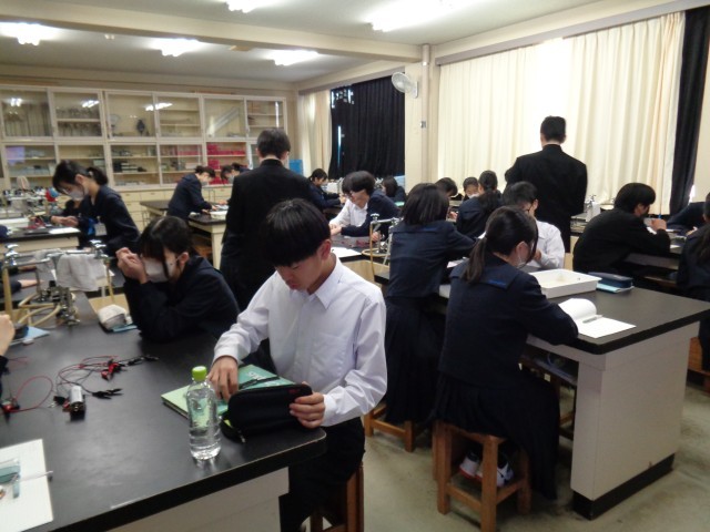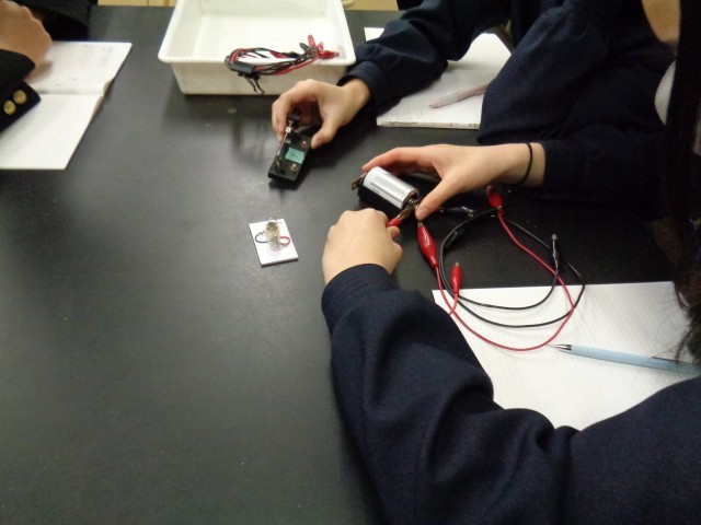 2学年の理科です。理科室で電流の学習をしています。今日は豆電球を使って回路を作っていました。
