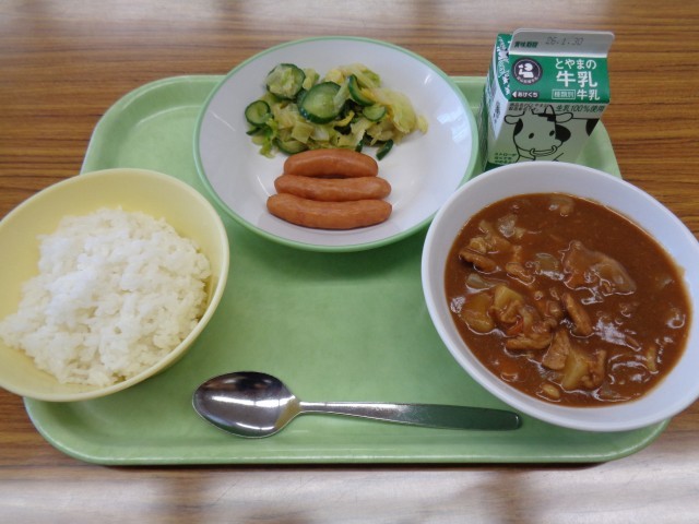 メニューはごはん、牛乳、ハヤシライス、あらびきウインナー、グリーンサラダでした。おいしくいただきました。来週は学校給食週間です。どんなメニューがでるのか楽しみですね。