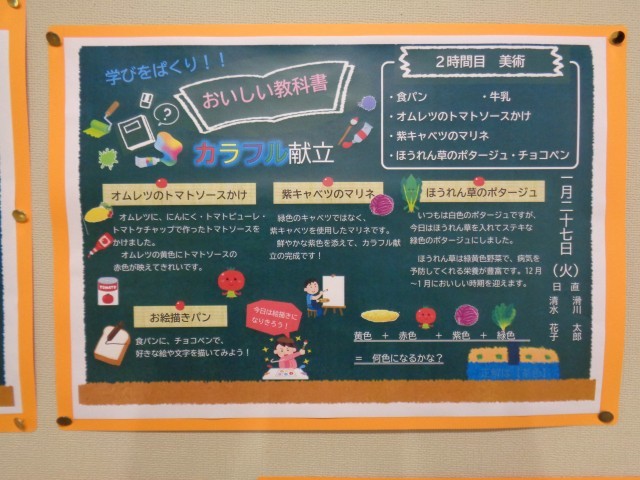 今週は学校給食週間です。今日は「美術」です。赤色、紫色、緑色が映える給食です。チョコペンで好きな絵や文字を描けるお絵描きパンもあります。