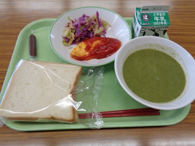 メニューは、食パン、牛乳、オムレツのトマトソースかけ、紫キャベツのマリネ、ほうれん草のポタージュ、チョコペンでした。楽しくおいしくいただきました。