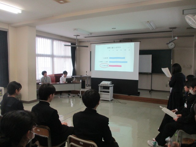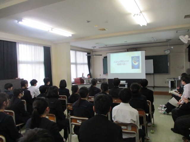 今日、学校保健委員会を行いました。「メディアと上手に付き合おう ~メディアコントロールでしっかり睡眠」というテーマで、本校のスクールカウンセラーであり、睡眠改善インストラクターでもある新井千賀子先生の講演を聴きました。はじめに本校の実態を保健体育委員会の生徒が発表したのち、いかに睡眠が大切か、メディアの長時間使用についての影響について聴きました。生徒の中から、「自分が勘違いしている部分もあったので、今後の睡眠の仕方を見直したい」という感想がありました。