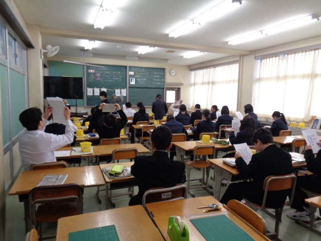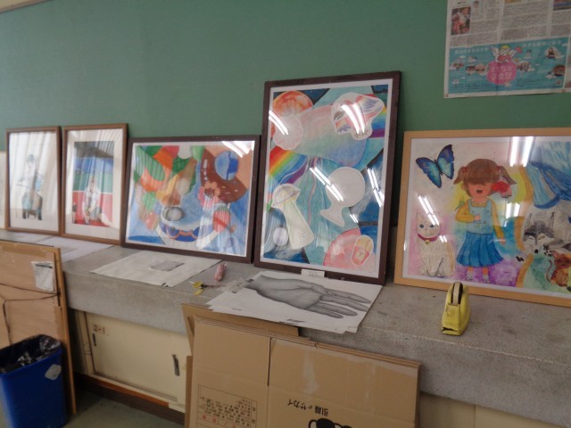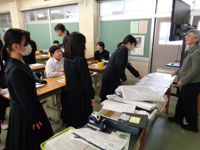 1年生の美術です。一人一人プリントをもらっています。美術室の中にたくさんの絵が展示しております。