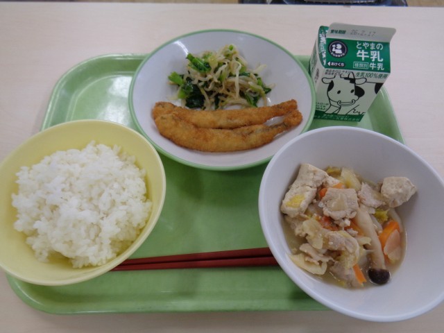 メニューは、ごはん、牛乳、ししゃもフライ、しょうがひたし、肉豆腐でした。おいしくいただきました。
