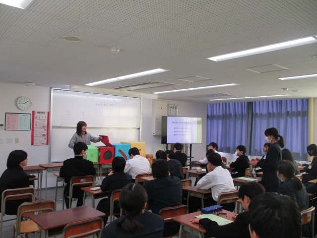 今日は、1学年を対象に富山市立清水保育所の方を講師にお迎えして「働く人に学ぶ講演会」を行いました。保育士を選んだきっかけや、働き続ける上で大切だと思うことについて話をしていただきました。また、幼児に実際に見せているおもちゃを生徒は興味深く見て、工夫点に感心した様子でした。