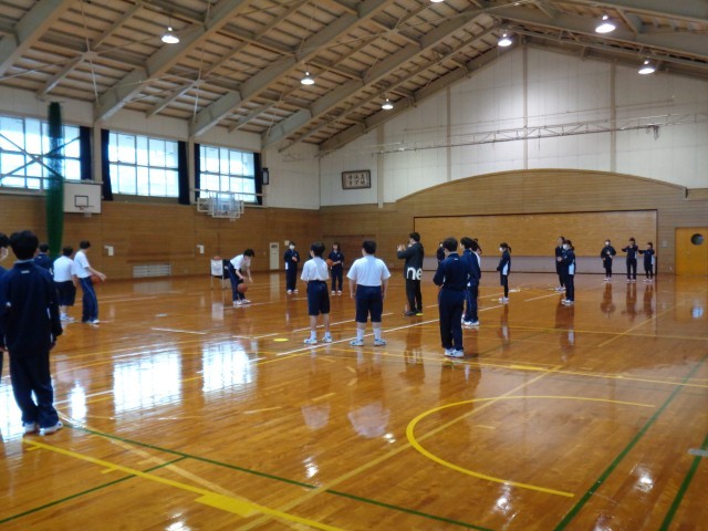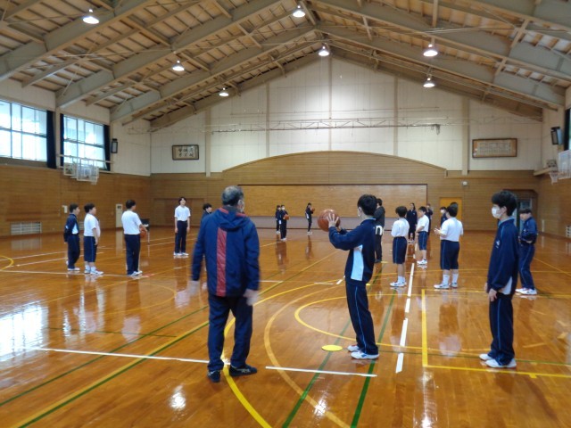 1年生の体育です。バスケットボールをしています。今日は、パスの練習です。突き指をしないためのキャッチの仕方等を練習していました。