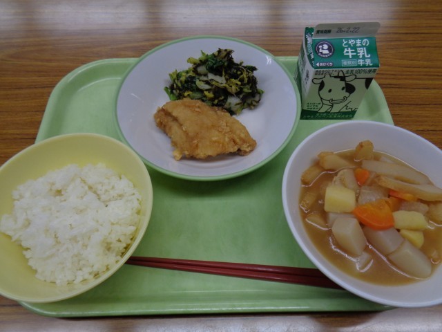メニューは、ごはん、牛乳、ホキの竜田揚げ、磯和え、おでんでした。おいしくいただきました。