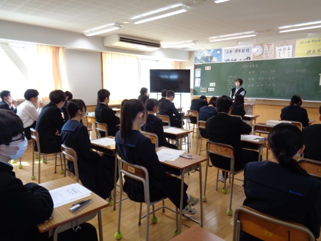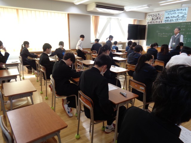 学年末考査が始まる前には全校生徒が着席しています。配布される問題を確認しています。学習の成果を出し切りましょう。
