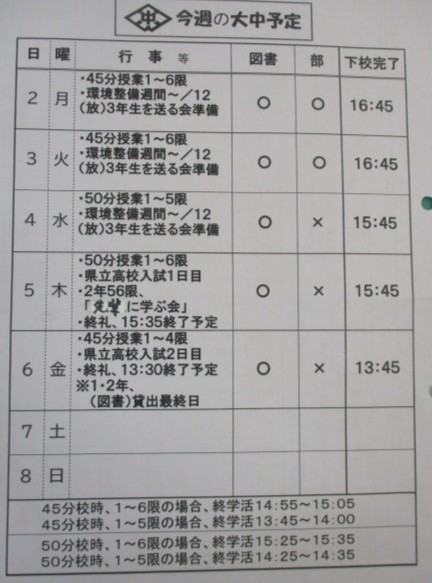 来週3/2~の大中予定をお知らせします。