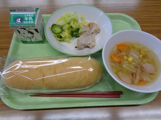 メニューは、コッペパン、牛乳、鶏肉の塩こうじ揚げ、そえ野菜、ひよこ豆のスープでした。おいしくいただきました。