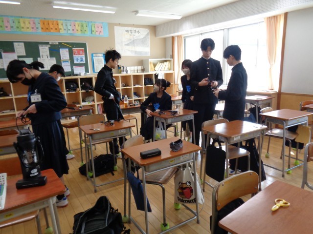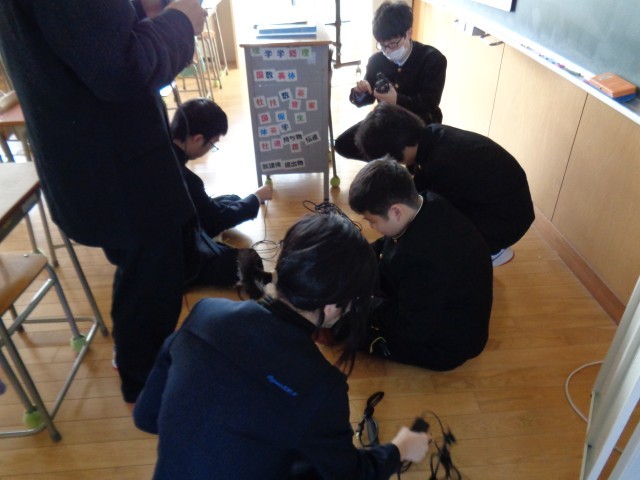 学校に登校した3年生がクロムブックのコードを片づけています。中学校生活もあと1週間になりました。