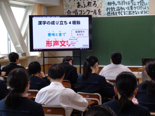 1年生の国語です。漢字の成り立ちを学習しています。音楽に合わせて楽しく学習を進めていました。