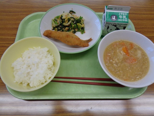 メニューは、ごはん、牛乳、ししゃもフライ、いり大豆和え、じゃがいものそぼろ煮でした。おいしくいただきました。