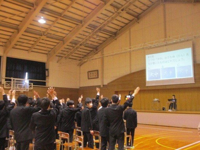 今日、生徒会執行部が企画した「3年生を送る会」を行いました。生徒は大泉中にまつわるクイズを全学年参加で楽しみました。一番盛り上がったのは、先生参加型のクイズでした。また、3年間の思い出スライドショーを見て、3年生は懐かしんでいました。卒業まであと3日。みんなで楽しく過ごしましょう。