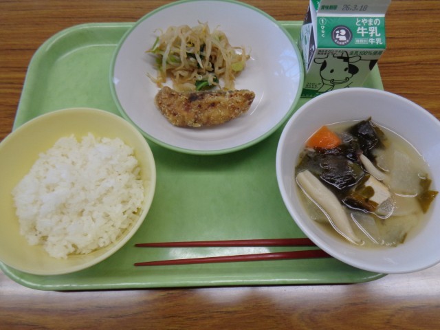 3年生は最後の給食です。メニューは、ごはん、牛乳、ふくらぎのカレー揚げ、おひたし、五目汁でした。おいしくいただきました。