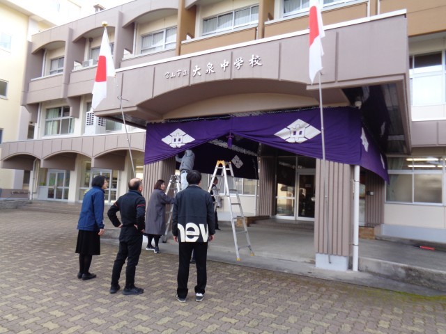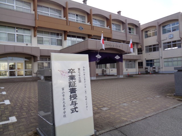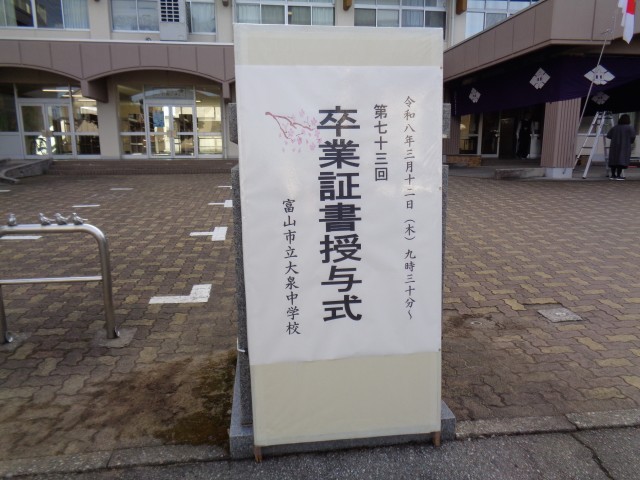 3月12日(木)卒業証書授与式の朝 公開日 2026/03/12 更新日 2026/03/12 今日の大中 今日は第73回卒業証書授与式です。気温は低いですが、よい天気になりました。看板や玄関幕の準備が整いました。 +1 今日の大中