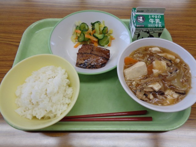 メニューは、ごはん、牛乳、にしんの生姜味、バンサンスー、豆腐の野菜あんかけでした。おいしくいただきました。