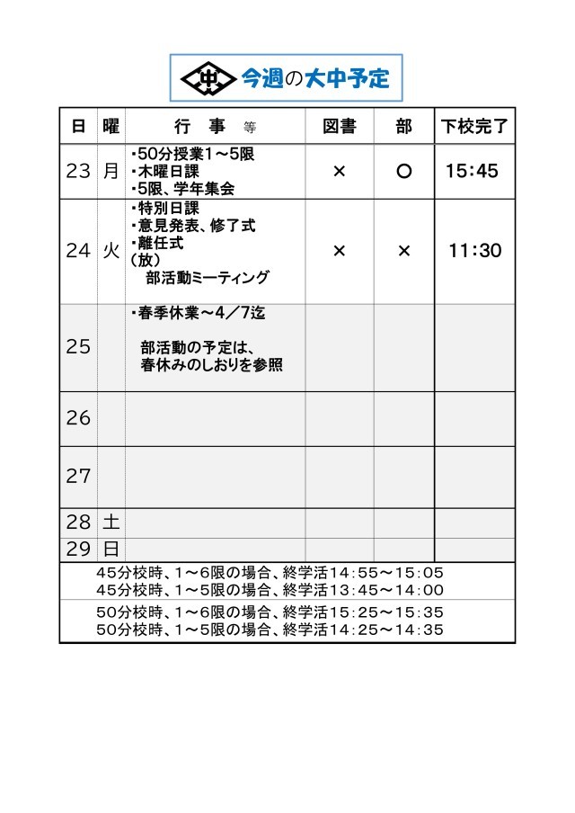 来週3/23~の大中予定をお知らせします。