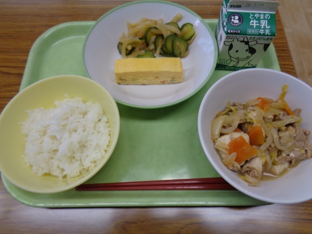 今日は給食最終日です。メニューはごはん、牛乳、千草焼き、大根サラダ、韓国風すきやきでした。毎日おいしい給食ありがとうございました。