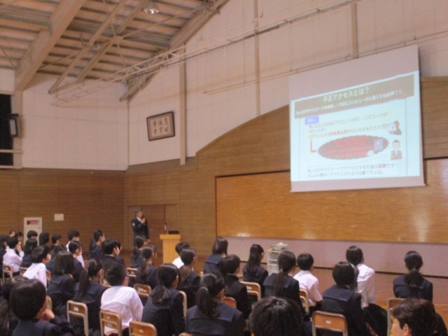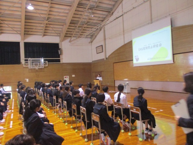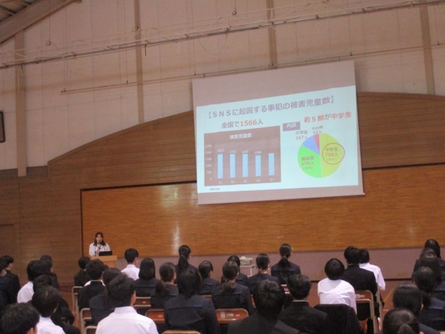 本日、少年サポートセンターの少年警察補導員の方と南警察署生活安全課の方を講師にお迎えして「SNS危険防止教室」を行いました。生徒は真剣に聞いていました。