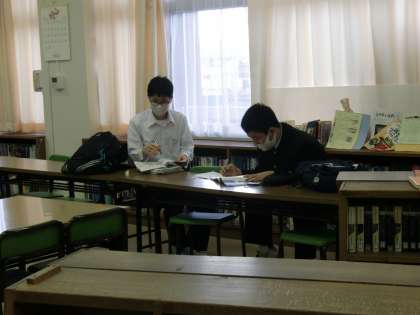 懇談会までの時間を図書室で過ごしています。(写真右)明日の期末考査に向けて、学習しています。