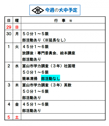 今週は富山市中学校学力調査(3年)があります。3年生頑張りましょう。